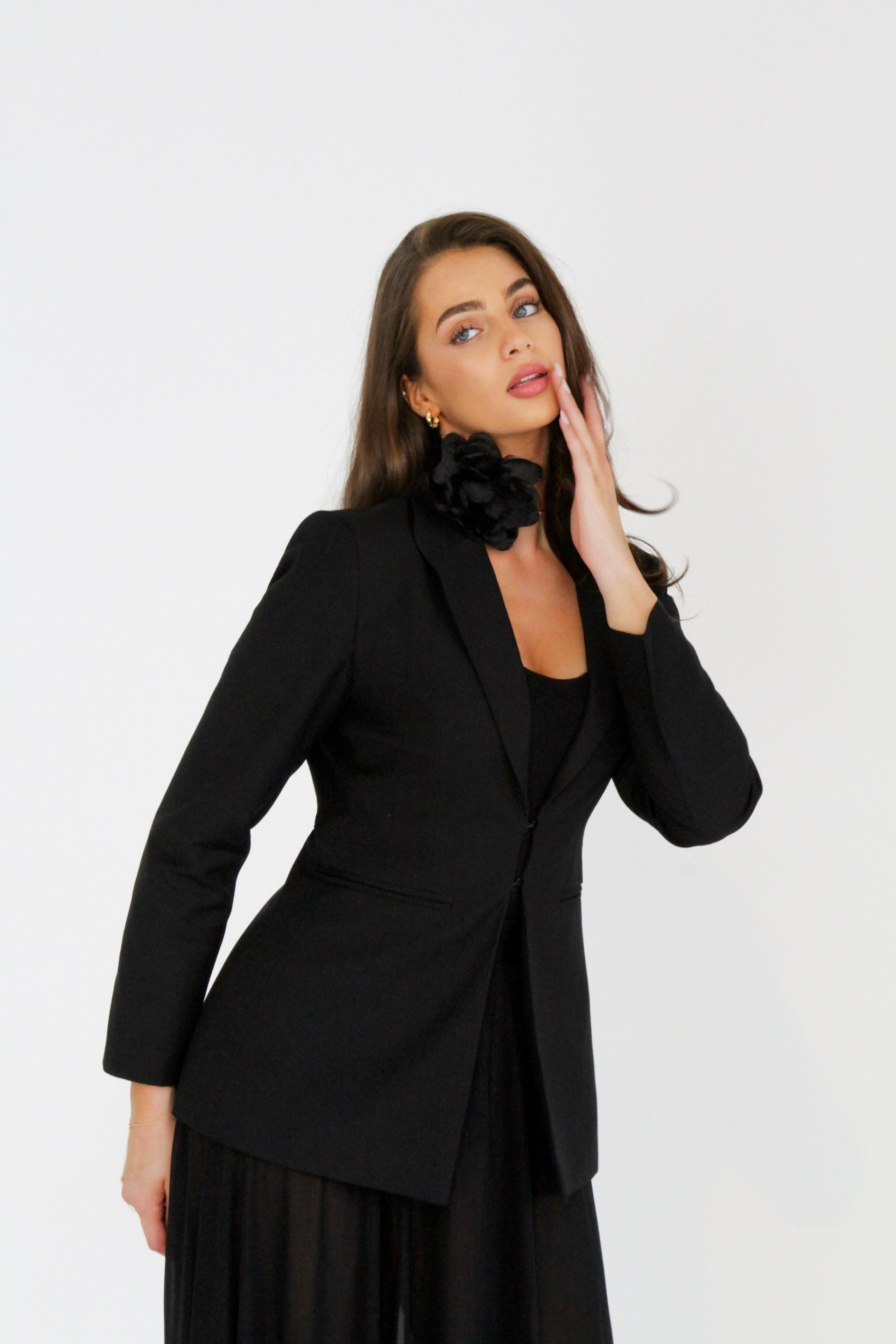 Our single-breasted design features a unique crossover lapel and an open back, creating an edgy yet structured silhouette.