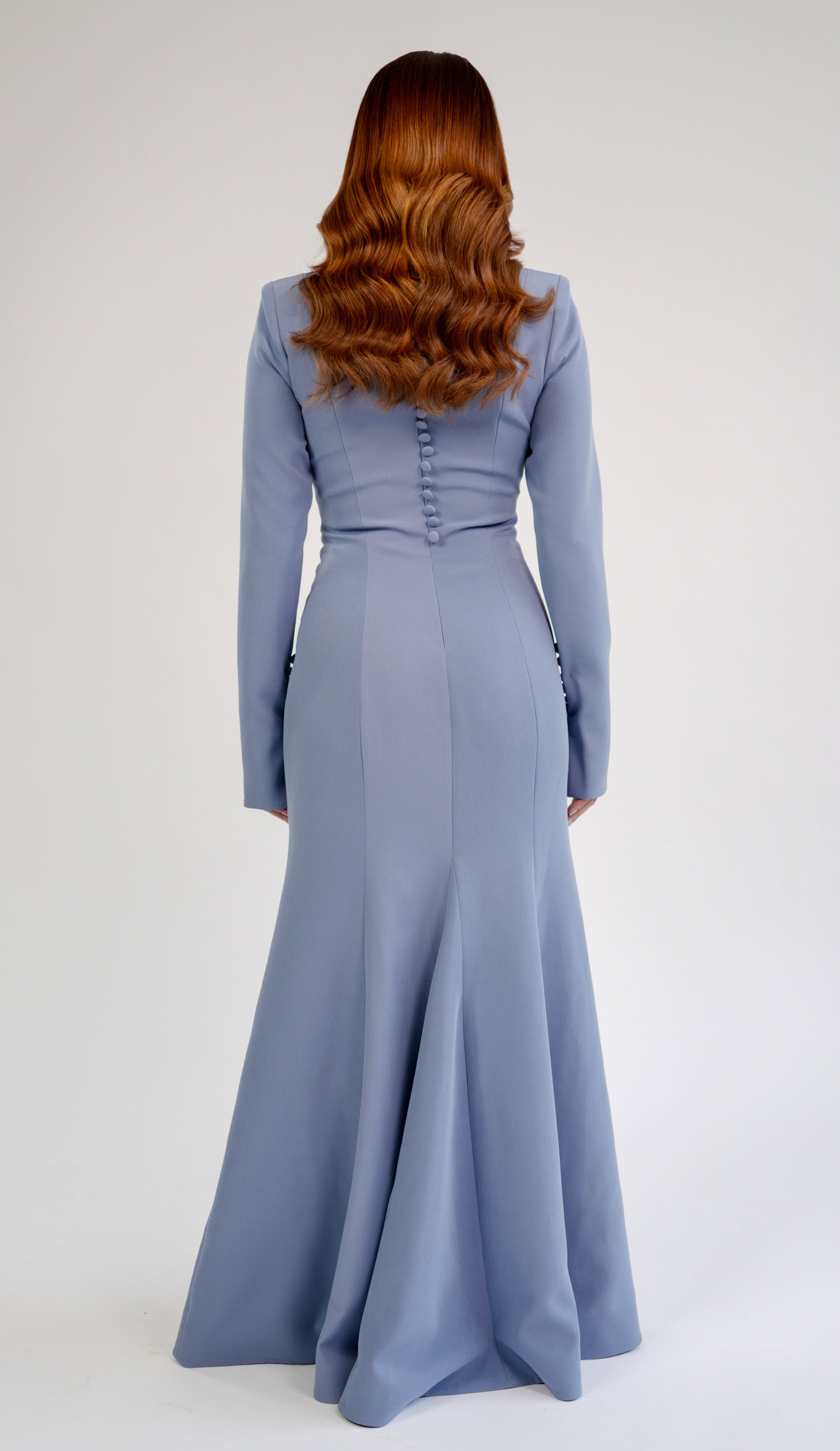 The Silhouette Gown in Power Blue features a high neckline, elongated sleeves with refined button detailing, a contoured bodice that defines the waist, and a dramatic flared hem, finished with a row of fabric covered buttons down the back that adds a couture touch to its clean, architectural silhouette.